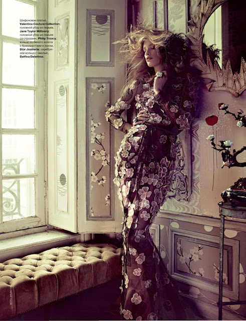 Io adoro da sempre lo stile floreale, il liberty per intenderci, e quindi di fronte a queste immagini vado in estasi!!! Queste foto sono dei capolavori, hanno trasformato la modella in una dea...Geniale l'abbinamento dell'abito bianco con la colomba, di quello rosa col fenicottero... questi colori soffusi, in quelle pose così magiche, sono straordinari! Mi verrebbe voglia di toccare quei tessuti... (e non solo quelli ah ah ^^)